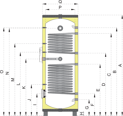Boiler de tip vertical, montat pe pardoseală, echipat cu serpentine, amplasate în partea inferioară și superioară. Pe baza dimensiunilor suprafețelor de schimb de căldură, este recomandat în special pentru surse de căldură care funcționează cu temperaturi mai ridicate ale agentului termic, cum ar fi cazanele pe biomasă, cazanele pe gaz sau panourile solare. O opțiune alternativă este racordarea externă a serpentinelor inferioare și superioare, rezultând astfel o suprafață de schimb termic mai mare.