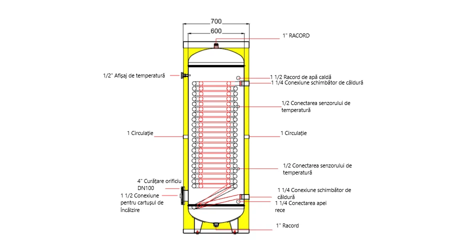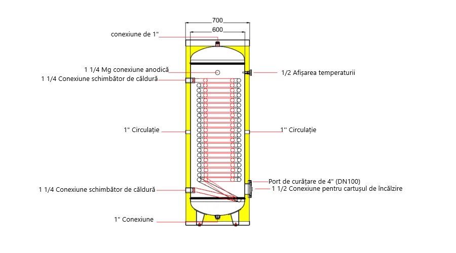 - corp de rezervor cu racorduri pentru apa de retea si recirculare si orificiu de curatare si racord de scurgere montat in partea inferioara/ laterala