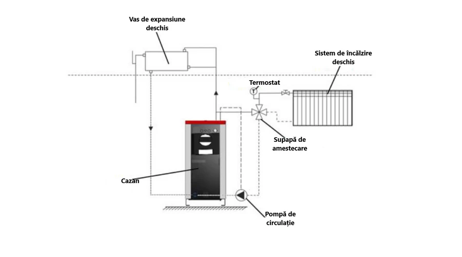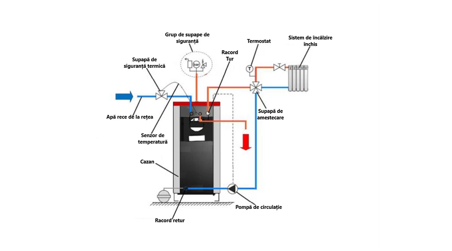 Pentru a asigura o durata de viata lunga a cazanului, se recomanda instalarea unei supape de siguranta de 60°C in circuitul de retur al incalzirii pentru a se asigura ca apa la temperatura scazuta, care poate cauza condens, nu se intoarce in corpul cazanului.