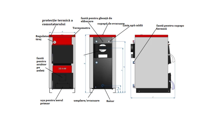 Pe usa inferioara a corpului cazanului, exista o deschidere din fabrica sigilata cu o pereche de placi de obturare pentru instalarea capului arzatorului pe peleti și o deschidere pentru aerul de ardere primara controlata de regulatorul de tiraj. Cazanul este dotat standard cu o bucla de siguranta termica a schimbatorului de caldura incorporata in camera de apa si cu un indicator de temperatura si un termostat de pornire a pompei pe partea din fata a cazanului.
