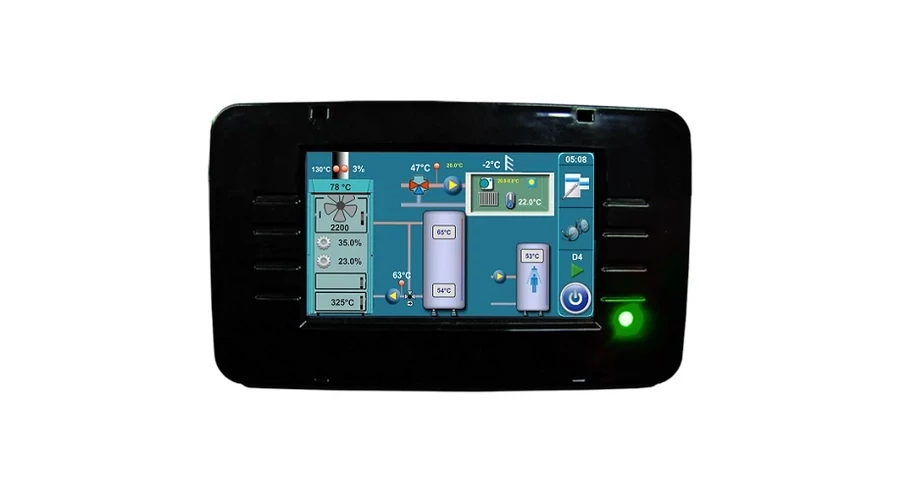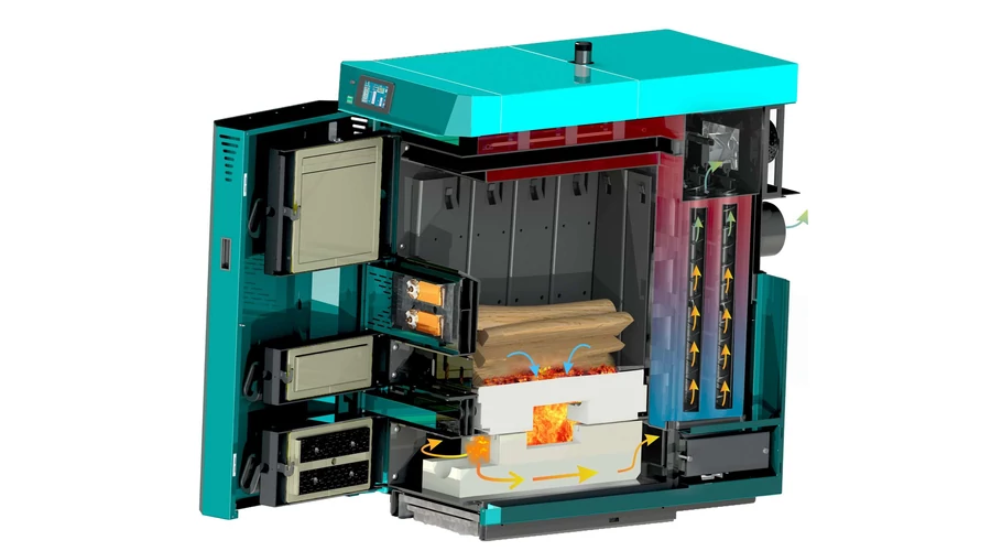 - Funcționarea cazanului este controlată printr-o unitate electronică încorporată, conectată la sonda lambda a cazanului, senzorul de temperatură al camerei de ardere, senzorul de temperatură a apei din cazan, senzorul de temperatură a gazelor arse, motoarele Belimo care reglează dimensiunea deschiderilor de aer, ventilatorul de gaze arse cu turație controlată. Astfel, reglează activ cantitatea de aer primar și secundar (prin ajustarea dimensiunii deschiderilor de aer cu 2 motoare Belimo), precum și turația ventilatorului cu sistem de extracție a gazelor arse.