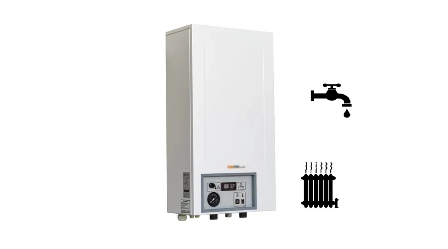 Sistem combinat, proiectat și construit pentru încălzirea centrală și producerea instantanee de apă caldă menajeră, un cazan de apă electric aproape 100% eficient cu o putere de 28 kW.