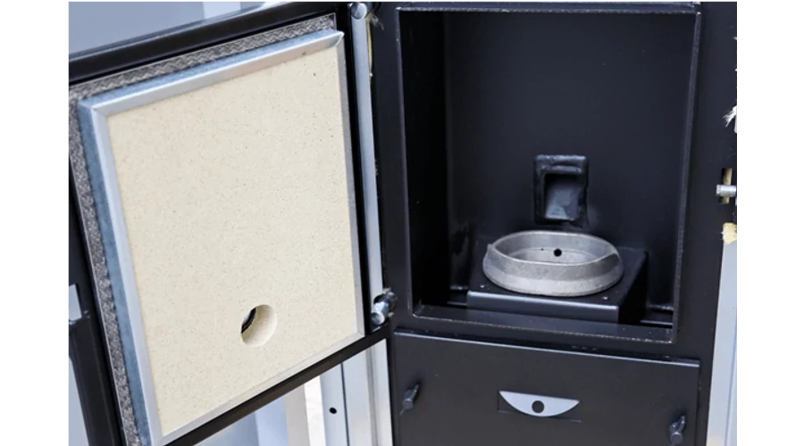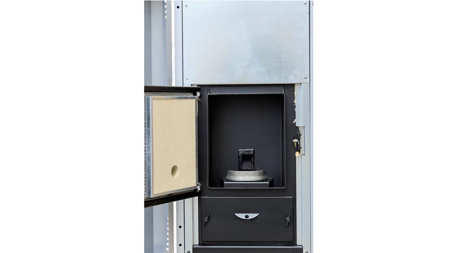 - curățare mecanică automată a grătarului cu un melc de evacuare automată a cenușii, care transportă cenușa din cazan într-o cutie de depozitare externă a cenușii, dispusă în partea dreaptă a cazanului