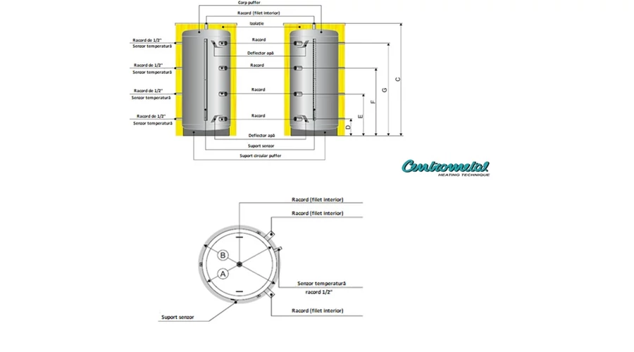 Rezervoarele tampon conectate la sistem captează și stochează energia termică provenită din sursa de căldură și o eliberează treptat, în funcție de necesitățile de încălzire sau răcire. Rezervoarele de acumulare Centrometal CAS HV sunt disponibile în mod standard cu capacități între 300 și 5000 de litri. Pentru capacități peste 5000 de litri, pot fi comandate dimensiuni și configurații personalizate, conform cerințelor clientului. Cel mai mare rezervor produs de Centrometal a avut o capacitate de 200.000 de litri (vezi imaginea de mai jos).