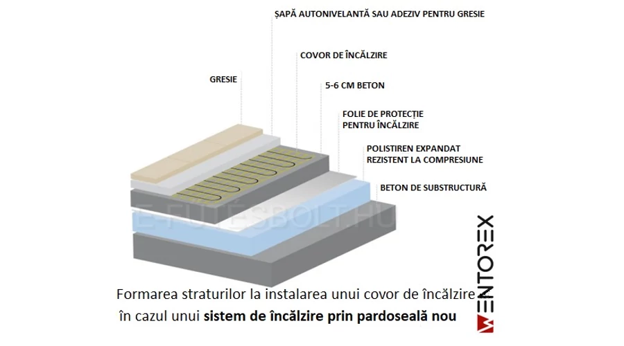 INFORMAȚII IMPORTANTE A Pentru o instalare corectă și pentru a obține o eficiență mai bună a încălzirii și a consumului de energie, utilizați izolație de bază / material izolant sub covorul de încălzire. În oferta magazinului nostru online sunt disponibile plăci izolatoare din polistiren cu grosimi de 6 și 10 mm. Cablurile covorului de încălzire nu pot fi tăiate sau prelungite, însă plasa din fibră de sticlă a covorului poate fi tăiată sau ajustată liber, în funcție de forma și caracteristicile spațiului. Covorul de încălzire este protejat împotriva contactului electric (IP67) pe întreaga suprafață, datorită cablului de împământare conectat. Pe suprafețele de podea acoperite cu covor de încălzire nu se pot amplasa piese de mobilier fixe sau obiecte grele. Mobilierul așezat pe suprafața încălzită trebuie să aibă picioare de cel puțin 4-5 cm înălțime pentru a permite existența unui spațiu de aer! Se recomandă calcularea pierderilor de căldură înainte de instalarea covorului electric de încălzire ca sursă principală de căldură. Înainte de achiziție, consultați-vă cu echipa de montaj și evaluați pierderile de căldură și gradul de izolație al proprietății dumneavoastră!