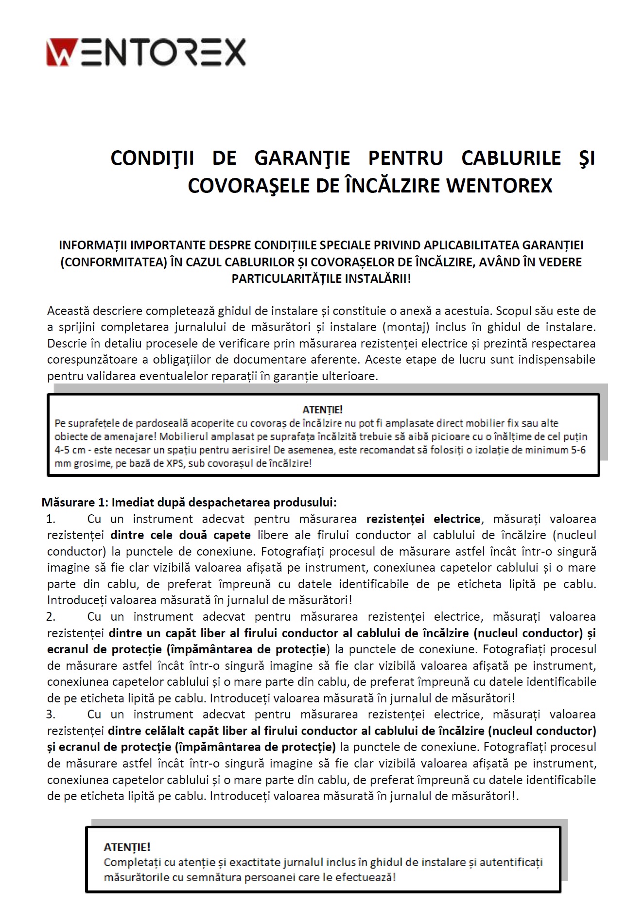 - Pachetul covorului de încălzire include un ghid de instalare în limba română, protocoale de testare și descrierea detaliată a condițiilor de garanție.